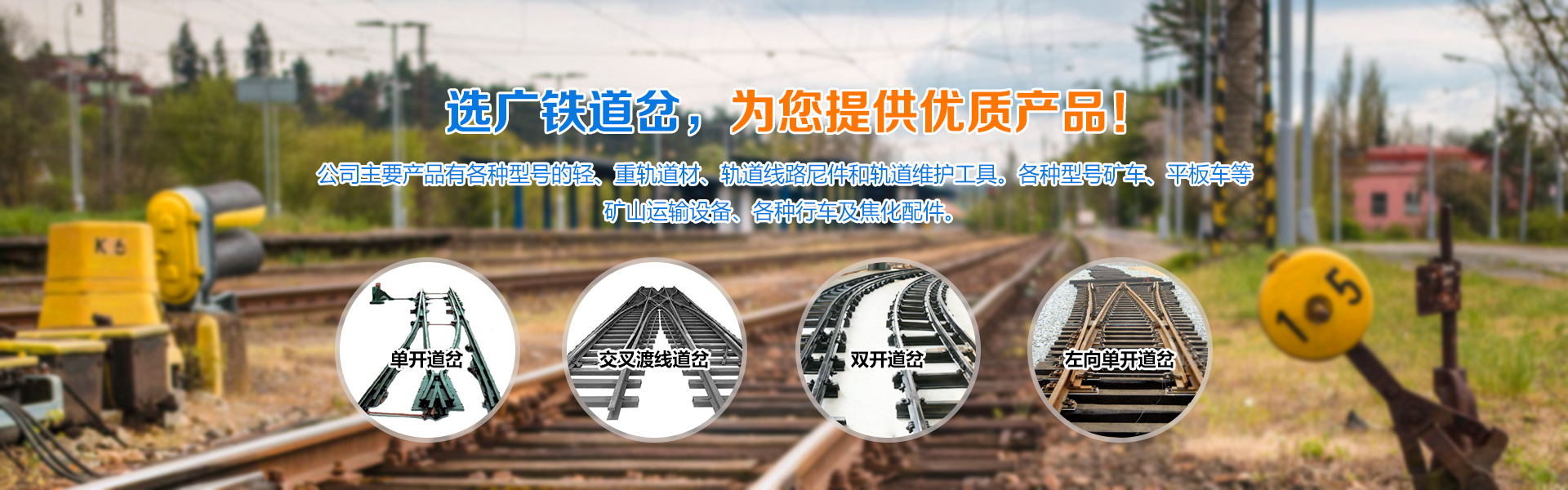 林州市廣鐵道岔有限公司擁有大型現(xiàn)代化高精生產(chǎn)設(shè)備及完善的質(zhì)量檢測(cè)體系,產(chǎn)品完全符合國(guó)家質(zhì)量檢測(cè)標(biāo)準(zhǔn),滿足廣大客戶的需求。公司主要產(chǎn)品有各種型號(hào)的輕、重軌道材、軌道線路尼件和軌道維護(hù)工具。各種型號(hào)礦車、平板車等礦山運(yùn)輸設(shè)備、各種行車及焦化配件。產(chǎn)品覆蓋3大系列200多個(gè)品種。為服務(wù)鐵路、冶金、煤炭郎實(shí)現(xiàn)鐵路道岔運(yùn)輸標(biāo)準(zhǔn)化、現(xiàn)代化、自動(dòng)化需求,實(shí)現(xiàn)鐵路道岔運(yùn)輸標(biāo)準(zhǔn)化、現(xiàn)代化、自動(dòng)化需要。